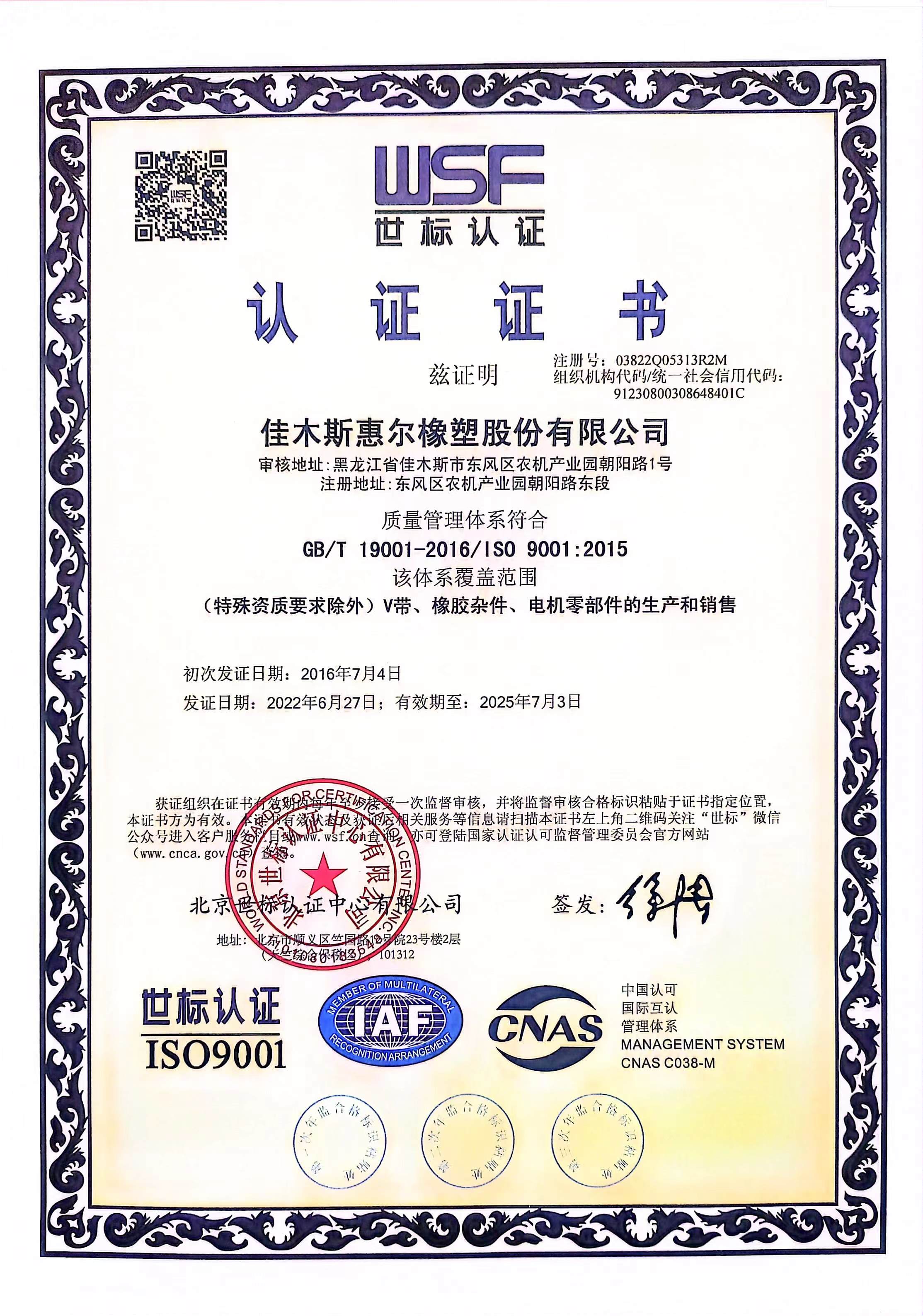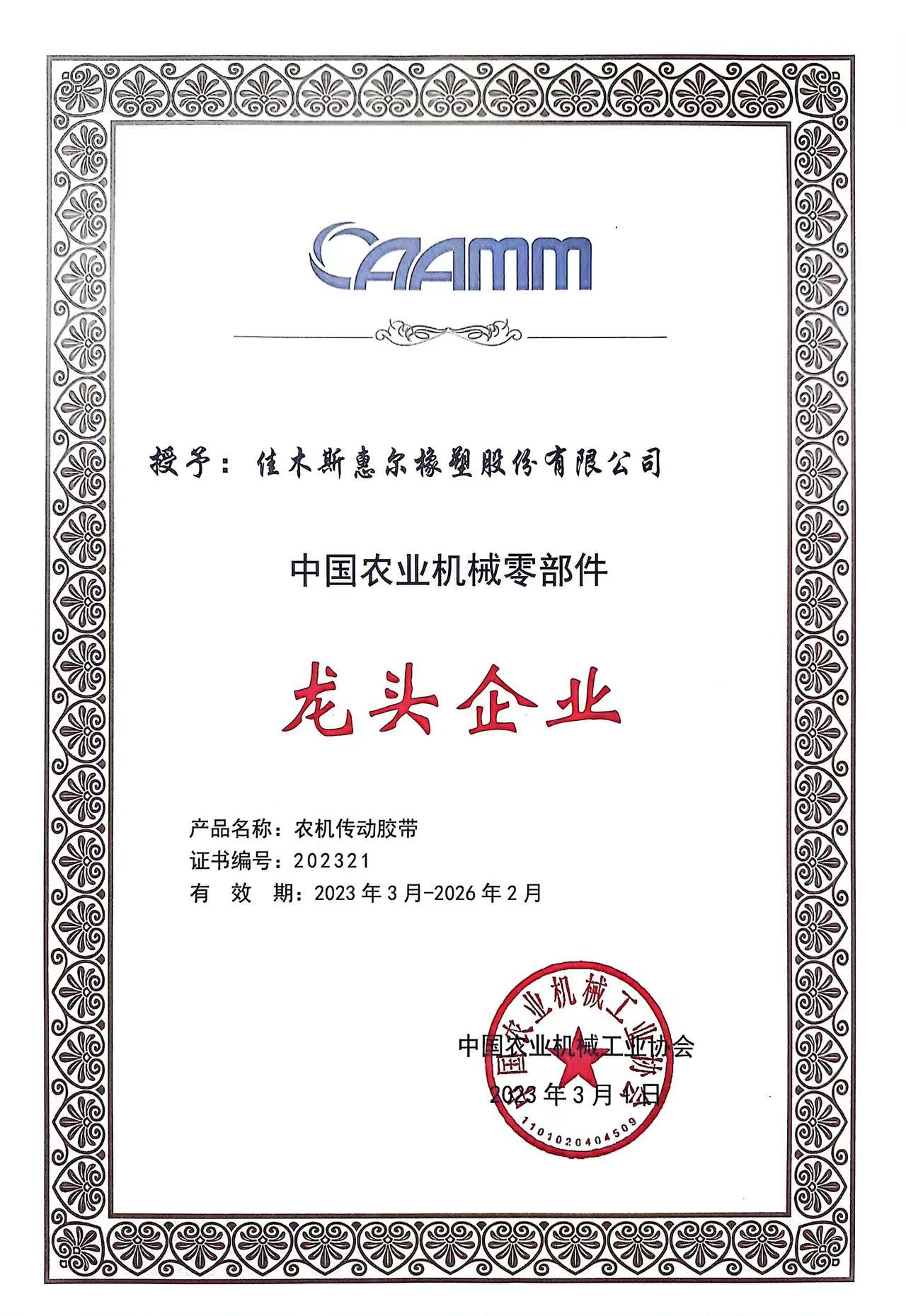 公司通過(guò)了ISO9001:2016質(zhì)量管理體系認(rèn)證,榮獲了高新技術(shù)企業(yè)稱號(hào),獲得了由中國(guó)農(nóng)業(yè)機(jī)械工業(yè)協(xié)會(huì)授予的農(nóng)機(jī)零部件(橡膠傳送帶)“龍頭企業(yè)”證書。環(huán)星品牌被評(píng)選為 “精耕杯”用戶滿意十佳農(nóng)業(yè)機(jī)械零部件產(chǎn)品金獎(jiǎng)。產(chǎn)品還獲得全省用戶滿意產(chǎn)品、黑龍江省榮譽(yù)。